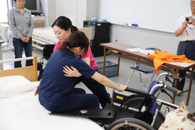 スライドボードを使用したベッドから車椅子への移動について演習を行いました。