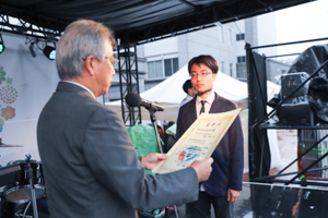 10月19日(土)に行われた文化学園祭のオープニング(特設ステージ上)で、学友会会長特別賞受賞者の表彰が行われました。表彰されたのは2人です。