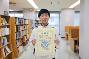 1人目は、リハビリテーション学科理学療法学専攻4年生の志田竜望さん。志田さんは、昨年度後期の会長特別賞を受賞していました。平成30年度東北地区大学準硬式野球秋季リーグ戦において攻守で活躍し、チームを1部昇格に導いた功績が評価され、外野手部門でベストナインに選ばれたことが受賞理由です。