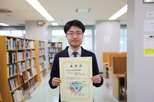 2人目は、建築環境学科3年生の佐藤智耶さん。佐藤さんは、実践教育訓練研究協会主催の第2回建築設計競技において、63作品の中から1等賞を受賞し、今年度前期の会長特別賞受賞者に選ばれました。秋保温泉街を想定した店舗併用住宅の設計にリアリティがあること、温泉街全体の活性化を視野にいれた設計であることが評価されたものです。