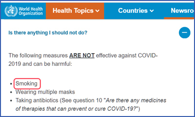 WHO新型コロナ感染症のQ&Aのページ 「してはいけないこと」
