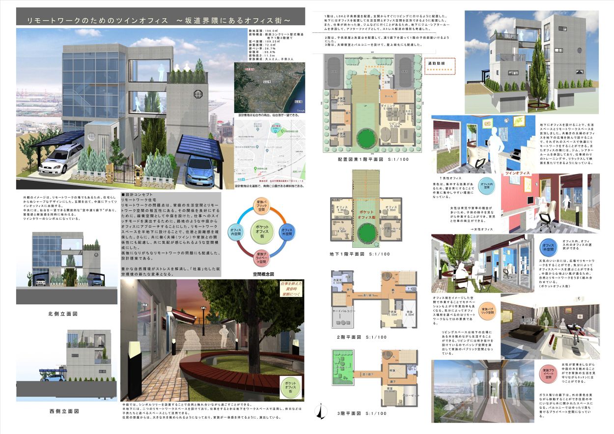 海を臨むことができる高台に、RC 造4層構成の住宅の提案である。この最下の地下1階に「ポケットオフィス街」を設けており、この空間概念がたいへん興味深い。通勤移動がなく日々の生活が単調になりがちなリモートワークの課題を、あえて一度私生活の玄関から強制的に外出させ仕事スペースに至る動線が、住人の気持ちのメリハリに寄与できる。また孤立しやすいリモートワークに対しお互いの気配を感じさせる間取りも興味深い。