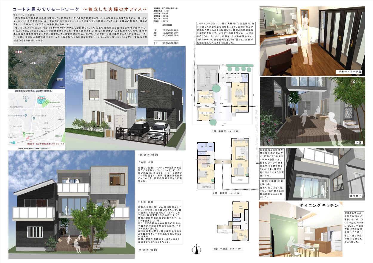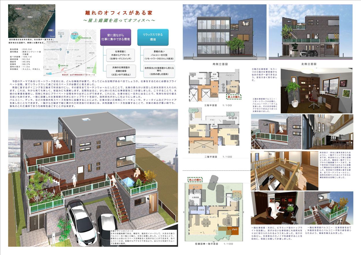 自宅でリモートワークを行う際の悩みとして��家族の話し声や家事の生活音、同居家族のオンライン会議の声等の雑音が気になり仕事に集中できない点が上げられている。作品は共働き夫婦が家族のつながりを保ちながらお互いに快適にリモートワークを行える住宅の提案である。1階は家庭生活の空間とリモートワークの空間を分棟して明確に分けた上に、リモートワーク室を別々に設けながら、1室につなげても使用できるよう配慮されている。また、分棟としても家族がお互いに見える関係にあり、ワークスペースからも居住感をリンクさせる工夫が取られている。細かい部分まで考えられた設計が高く評価された。