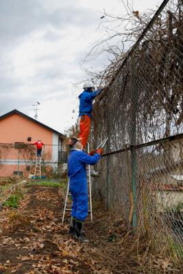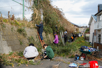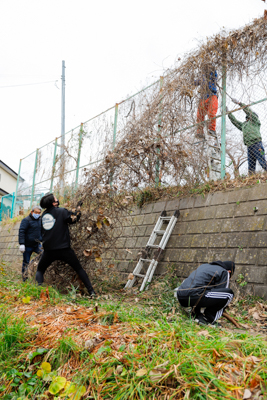東北文化学園大学の学生・教職員がボランティア活動の一環として、国見コミュニティ広場のフェンスに生い茂るツタの除去作業を行いました。