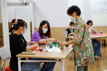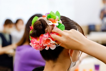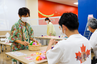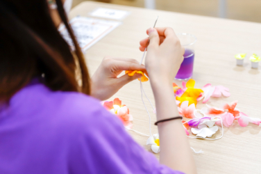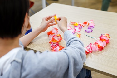 C&C英語講師・ハワイ出身のリアーン先生と英会話を交えながら、一緒に”レイ”作り。