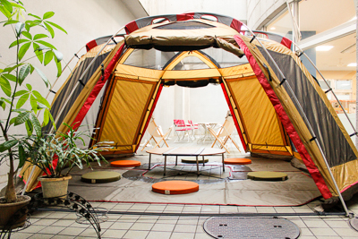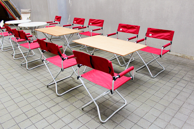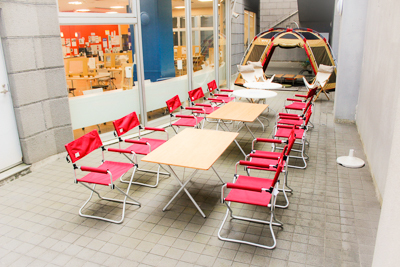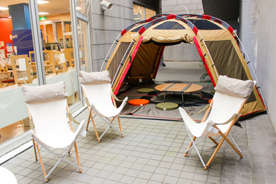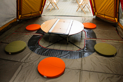 設置したsnowpeak社製のテントとテーブル、イスは同窓会から寄贈いただいたものです。