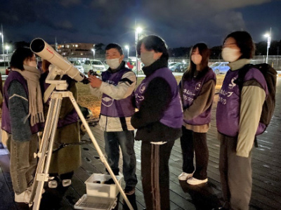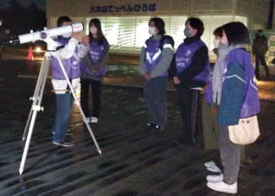 そうした今回の“皆既月食を見る会”のスタッフボランティアとして探求・理解プロジェクトの「地域活動・ボランティア」(1年次配当)と「ボランティア探求」(2年次配当)の受講生5名がボランティア実習を兼ねて指導教員の渡邊特任教授と共に参加しました。ボランティアの業務内容としては天体観測専門のスタッフから手ほどきを受け、仙台西高等学校の地学部の生徒さんたちと共に観測機器(天体望遠鏡やモニター)の操作や参加した地域住民への働きかけや天体観察のケア等を行いました。また、併せて土星・木星・火星等の観察補助にも従事しました。