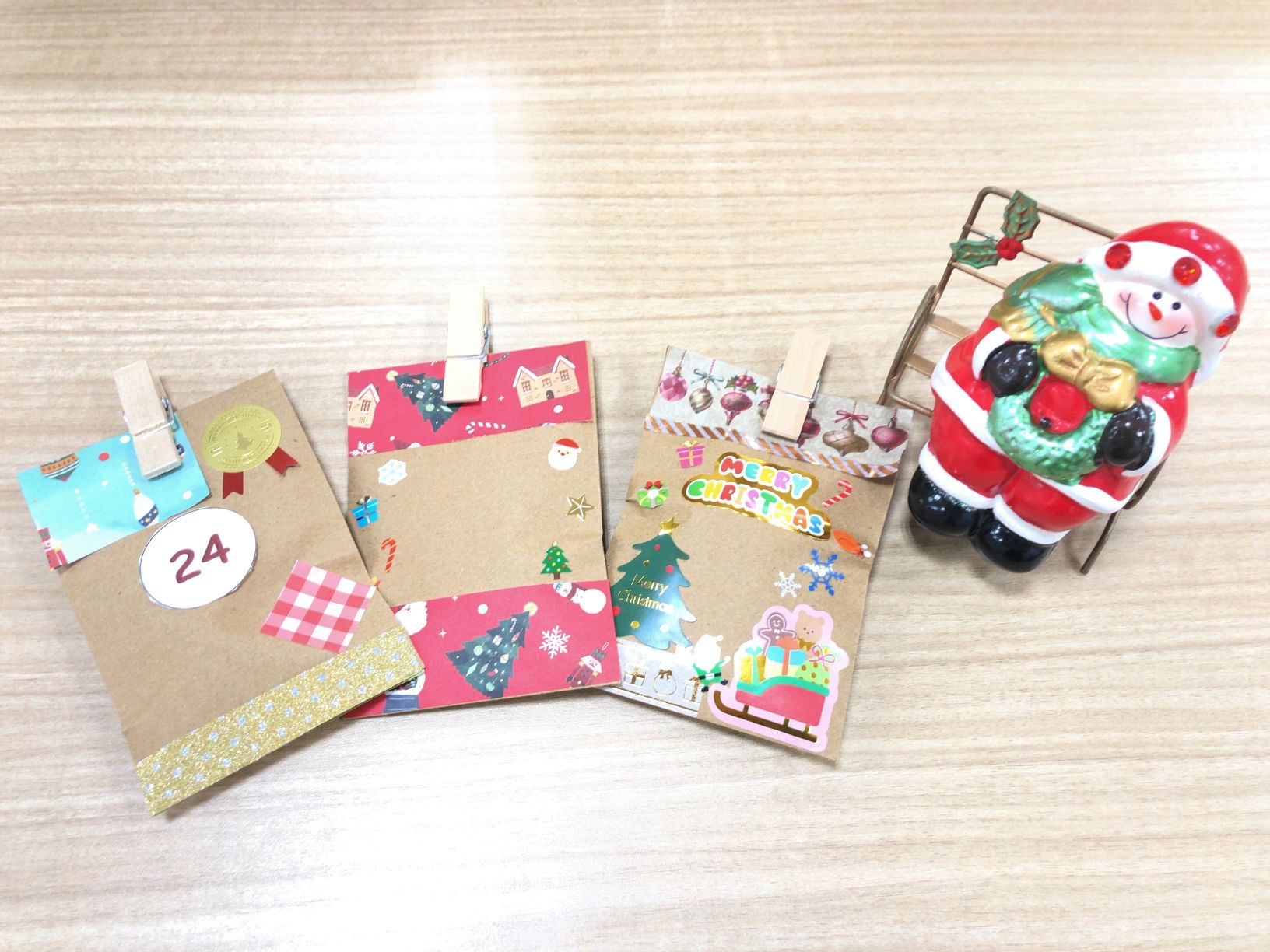 封筒にマスキングテープやシール、折り紙などを貼り、中にはチョコレートや飴をいれてアドベントカレンダーを作ります♪
