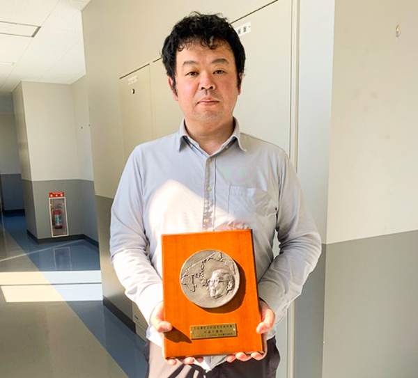 本賞の楯(レリーフ:彫刻家 吉野毅)を持つ中島講師