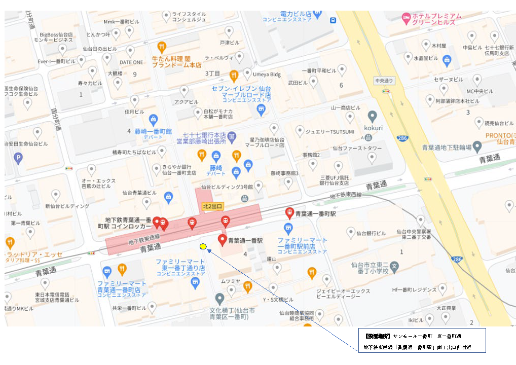 場所はサンモール一番町東一番町通 地下鉄東西線「青葉通一番町駅」南1出口前付近です。
