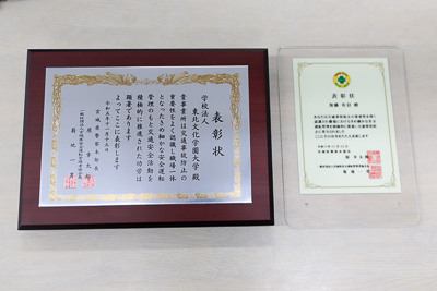 学校法人東北文化学園大学では、教職員の交通安全教育や自動車の交通事故防止に向けた環境作りを行っています。この功績が認められ、宮城県警察本部、一般社団法人宮城県安全運転管理者協会より表彰を受けました。