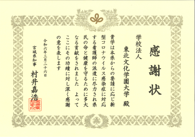 宮城県知事から新型コロナウイルス感染症対応看護職員派遣事業に係る感謝状をいただきました