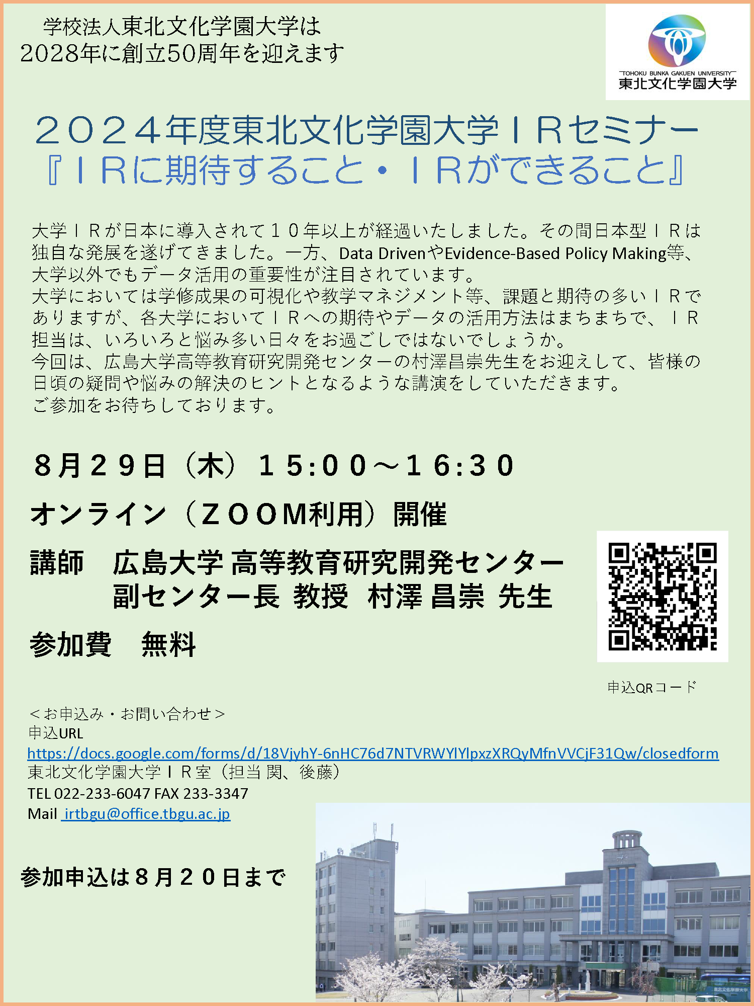 東北文化学園大学IRセミナー開催のお知らせ※申し込みを締切ました