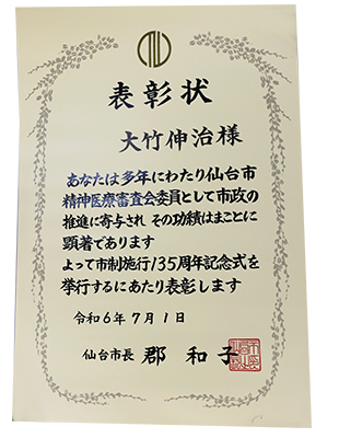 「この度、仙台市精神医療審査会委員として永年勤続の表彰を頂きましたこと、大変光栄に存じます。今回の表彰を励みに、これからも精神医療の発展と福祉の向上に微力ながら尽力してまいりたいと思います。」