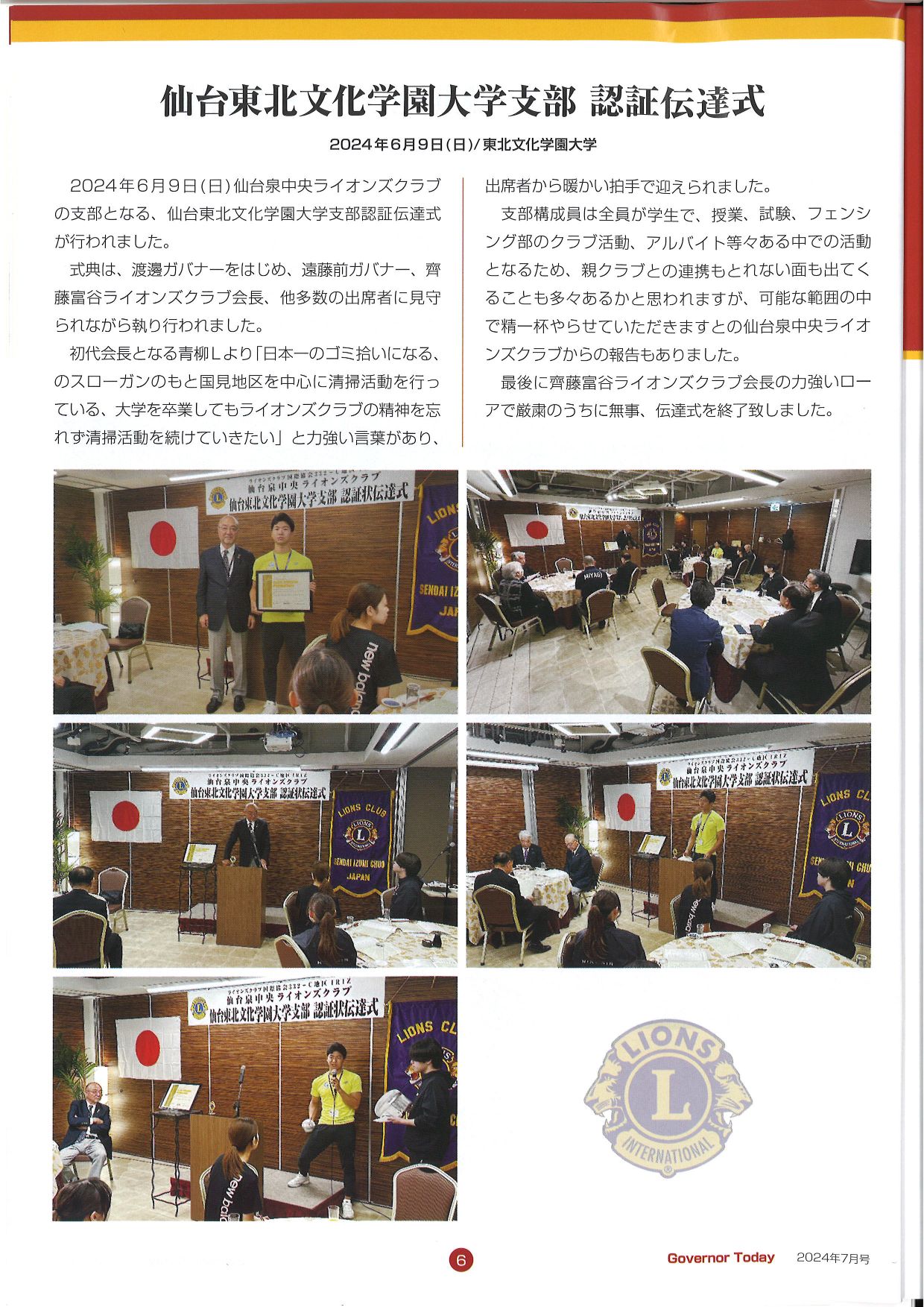 [掲載:ライオンズクラブ広報誌]仙台東北文化学園大学支部の認証伝達式に関する記事が掲載されました