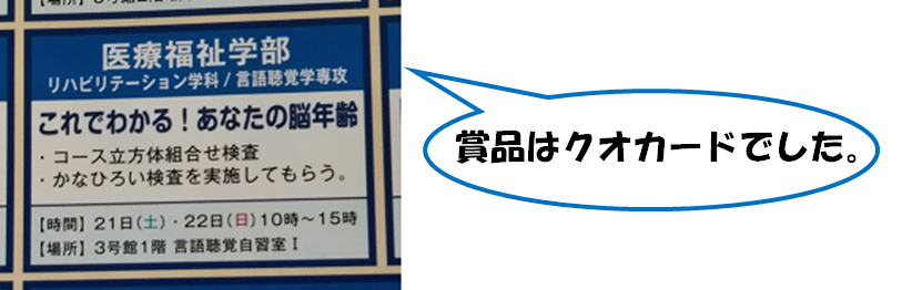 また学科企画では、【これでわかる!あなたの脳年齢】というテーマで、臨床の言語聴覚士が実際に行うことの多い心理テストを体験していただきました。「脳年齢」というタイトルに恐怖された方もいらっしゃったようですが、多くの方に興味を持っていいただき、これまでにないにぎやかな学科企画となりました。本専攻2年生(+一部1年生)も本当に頑張りました。
