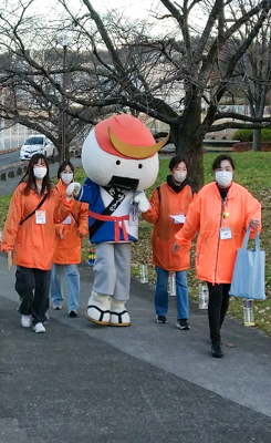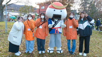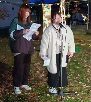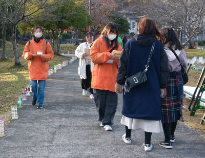 当日は天候にも恵まれ、多くの地域住民の方々が来場されました。本学でこの催事に参加するのは昨年についで2回目で、昨年も参加した学生もおり、準備段階からスタッフの方々の指示を受けながら走り回っていました。催事開始の16時30分に合わせて会場一帯に設置されたペットボトルランタンへの点灯作業や管理、会場へ赴いた参加者の誘導・整理を行うほか、今回は仮設ステージで行われるパフォーマンスの司会進行も任せられ、“むすび丸”の介添え役や写真撮影の補助等縦横無尽に活躍しました。