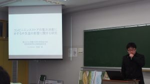 発表した学生は、4年間の学修の成果を発表するため、連日資料やプレゼンテーションの準備をしていました。この発表結果は、教員が主査・副査となって研究発表の内容や論点などについて、評価基準に基づき評価する最終テストでもあります。