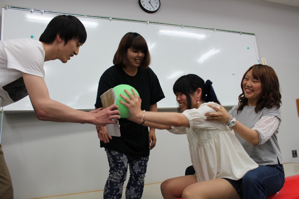 下記の写真は、今年の作業療法学実践論演習の授業の一コマです。症例の状態が書かれたものを読んでそこから考えられる問題点に対し、実際に「遊び」を用いた治療プログラムを検討して、それを実演してもらっています。それらの中で、上記に挙げたような分析を行い、実際に(こどもに見立てた学生に)提供してみて治療として本当に成り立つかどうかを考えてもらいます。「遊び」を考えるという授業ですので、学生も楽しみながら授業に取り組むことが出来、且つその難しさを体験することができます。