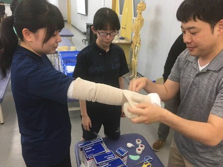 本講義では、基本的な講義とマニュアルリンパドレナージ、専用の弾性包帯を用いた圧迫療法について学びました。本学では約10年前からリンパ浮腫治療の講義を開講しており、国内でも最も早く取り組んだ大学かと思われます。