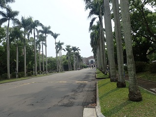 (台湾大学メインキャンパス内のヤシの大通り。奥に見える建物が大学の図書館。かなり歩きました)