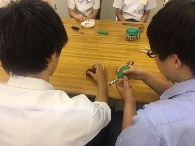 指が動きにくくなっても使える爪切りやスプーンを触ってもらいました。