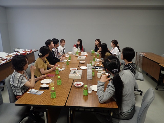 お昼に数名の学生と一緒にピザを食べながら交流を行いました.台湾訪問時はパワーポイントでの発表でしたが、今回は雑談形式でお互いに意見交換をしました.学生は食べることを忘れるくらい活発に話し合っていました.