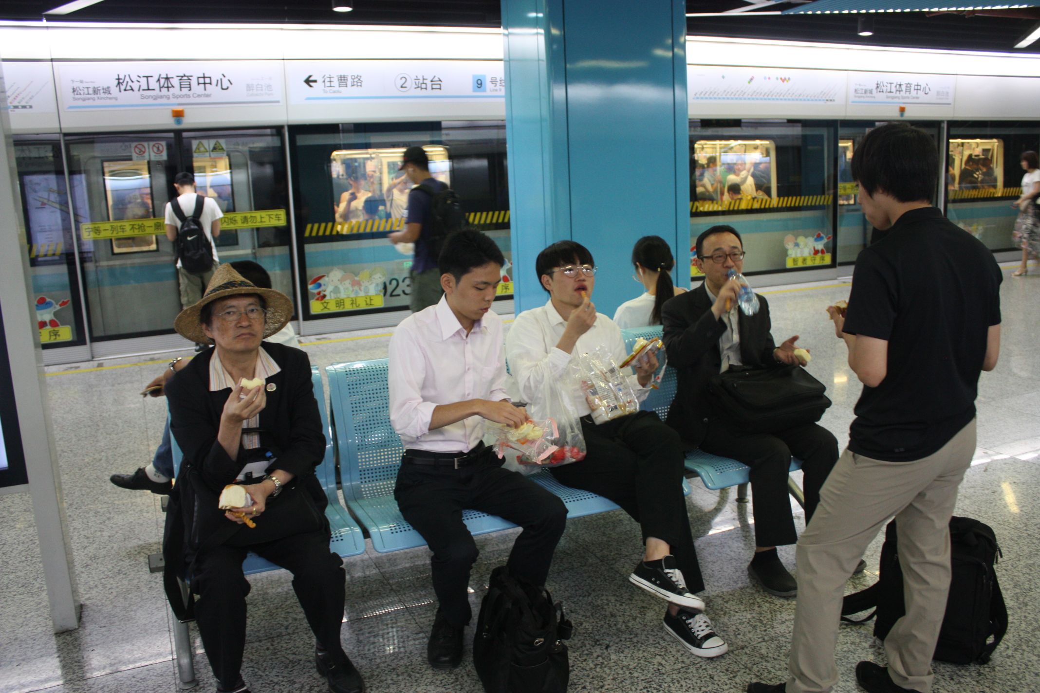 松江地下鉄駅で朝食(昨夜に近くのスーパーマーケットで用意したパン・水等)