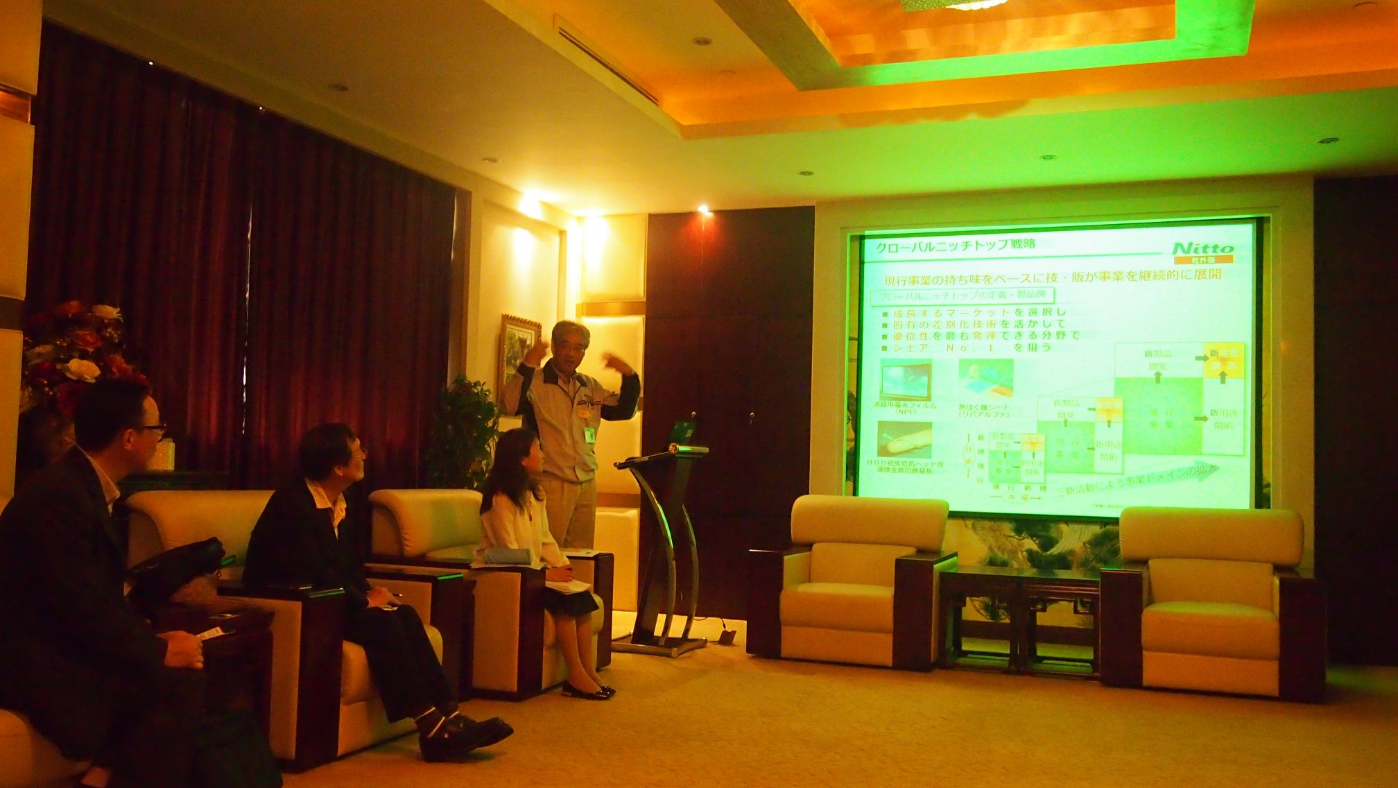 記念写真を撮った後、応接室で中国進出の苦楽について語る長津秀樹副社長、