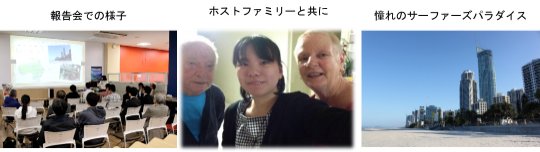 初めに、オーストラリア・ゴールドコーストに2週間滞在した大山美桜さん(2年生)が報告を行いました。中学生の頃、教科書に載っていたグレート・バリア・リーフを見て感動し、ずっと憧れを抱いていたオーストラリアでホームステイをしながら、現地の大学生のキャンパスライフや奨学金制度について調査してきました。見ず知らずの学生に英語でインタビューをするのはかなり勇気が必要だったと思いますが、貴重な意見をたくさん集めることができたそうです。