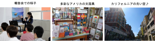 次に、アメリカのサンフランシスコでアイデア文具について調査してきた木村優花(2年)さんが、活動内容を報告しました。街の中心部に位置するユースホテルを拠点にしながら、UCバークレー校のブックストアや現地の有名な文具・雑貨屋を訪問し、日米アイデア文具の違いについて調べてきました。機能性が高い日本の文房具とカラフルでスタイリッシュなアメリカの文房具を掛け合わせて、東北地方を活性化する新しい文房具を開発したいそうです。報告会では作成中のデザイン画も披露してくれました。