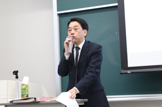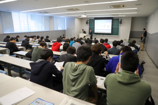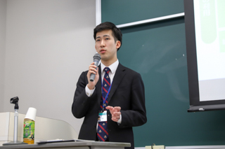 講演会の後半20分は、綜合政策学科の平成29年3月に卒業した財務事務官設楽弘通氏(仙台中税務署法人課税第三部門勤務)により、国税専門官を志した理由、そのために行った勉強、入庁後の研修の様子、研修から現在にいたるまでの仕事の内容、職場環境などについてお話があった。志を立て、計画的に勉強すれば目標を達成できることを強調され、是非後輩が続いて入ってきてほしいと懇願され、お話を締めくくった。先輩のお話により、本学科の学生には遠い彼方にあった国家公務員への道がより近く感じられたのではないかと思う。その意味で後輩たちにとって大変勇気づけられるお話であったように思われる。
