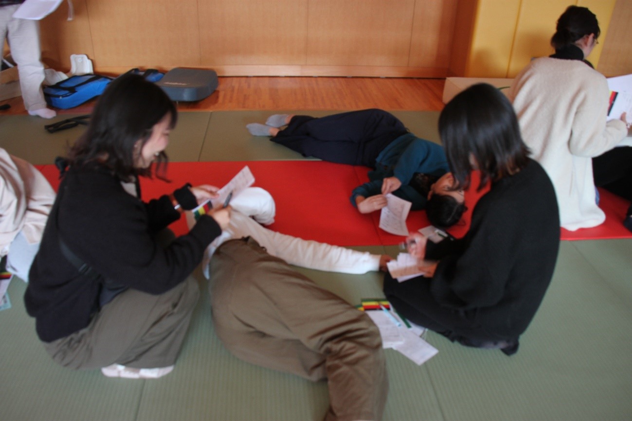 授業では、災害看護に必要な基礎知識を講義で学ぶだけではなく、体験的な学びも行います。