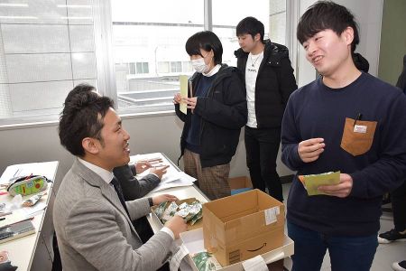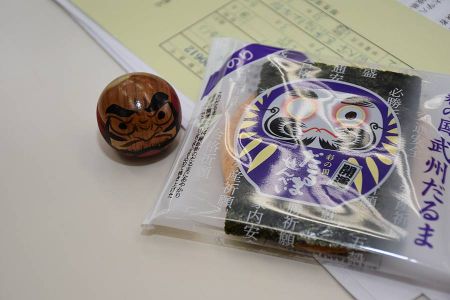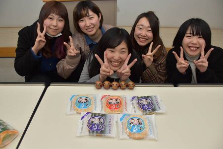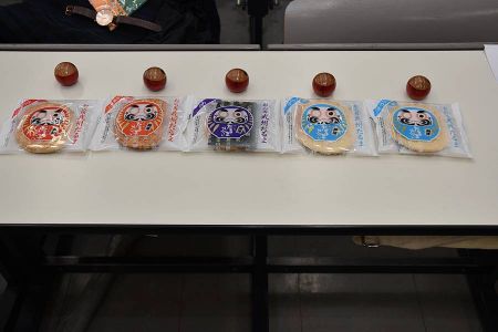 学生たちへ、「起き上がりだるま(松田工房)」や「だるま煎餅」を渡しました。