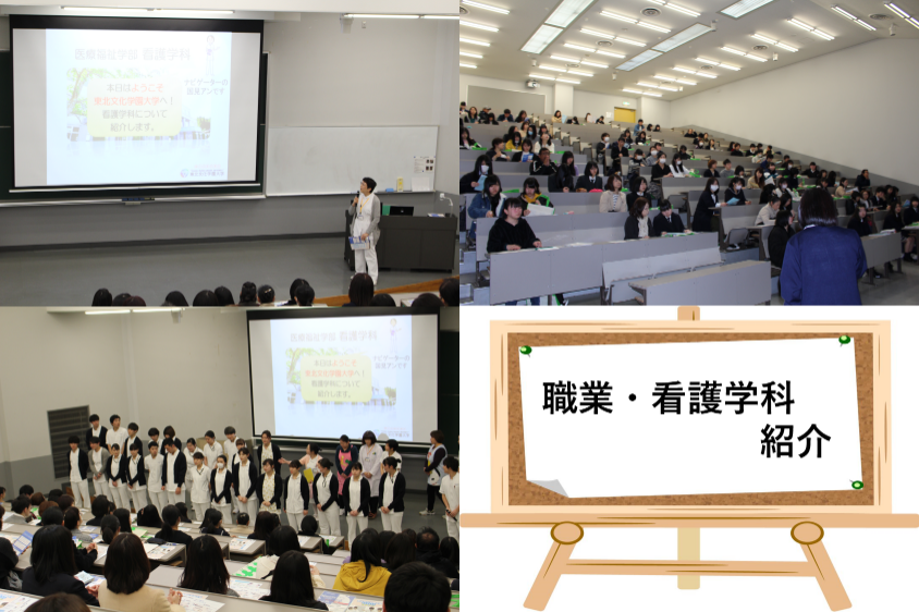 看護師・保健師の職業紹介と看護学科の特徴紹介を午前中に行っています。