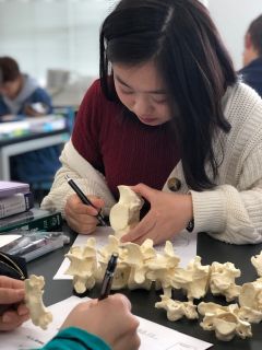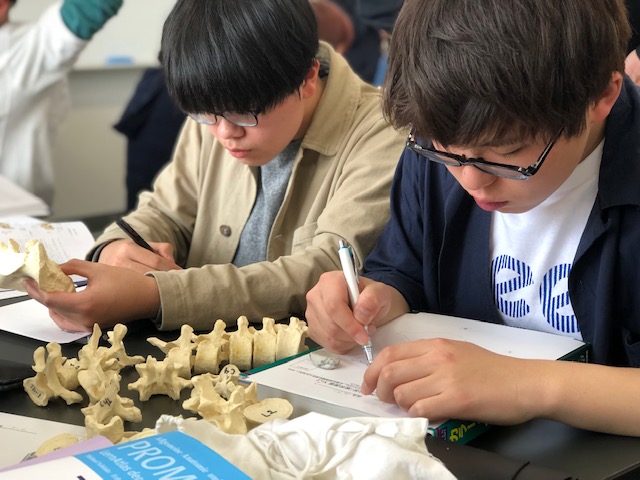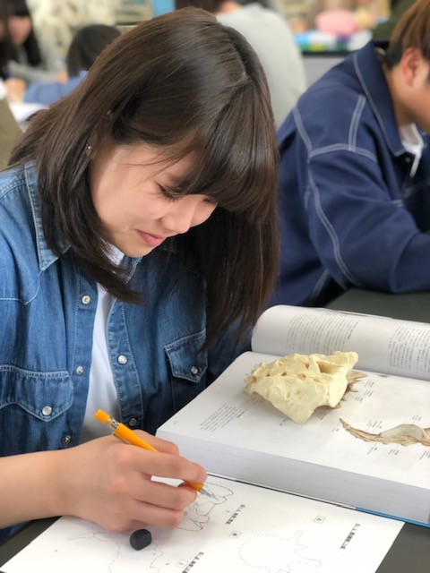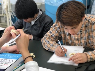 4月からは、骨のモデルに触れスケッチし立体的な構造を覚えます。