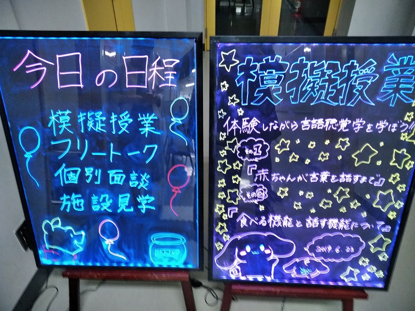 今回は、【赤ちゃんが言葉を話すまで】【食べる機能と話す機能について】というタイトルで模擬授業が行われました。その後、フリートークや個別面談で、言語聴覚士や本専攻の特色などについてお話しさせていただきました。