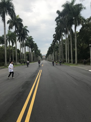 (台湾大学メインキャンパス内のヤシの大通り。広大なキャンパス内を学生さんは自転車で移動します)