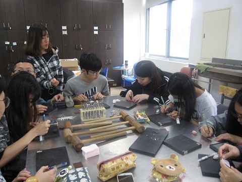 AMは1年生の授業である作業分析学に参加しました。今回の作業種目は「革細工」でした。本学でも1年次に革細工を体験し、作業特性を考える授業があります。とても印象的だったのは、1年生数名が皆の前で、革細工の授業をしていたことです!事前に革細工の方法や進め方、革細工の作業特性を分析し、その内容を授業内で他の1年生に伝授するという授業スタイルでした。教員は時々助言をしたり、最後にフィードバックをしていました。