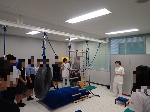 評価学実習室Ⅰ、ADL室、発達支援教室の3か所を見学しました。それぞれの教室で使用する検査器具や道具などの説明をしました。2年生にとっては先週の授業で習ったところでもあったため、身近な分かりやすい言葉を用いて説明をしていました。