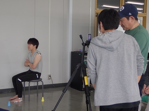 肩関節、股関節、膝関節、足関節などに目印をつけます。そして座っている状態から立ちあがり、それぞれの関節に貼った目印がどのように動くのかを動画で取り込んで、パソコンで処理をし、数値などで表していきます。