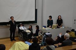 この企画はNPO法人「境を越えて」の本間里美氏(本学理学療法学専攻4期生)協力のもと実現できたもので、第1部は映画「風が生きよという」の鑑賞、第2部は当事者や家族、学生ヘルパーによるトークイベントを行い、それぞれの立場から生の声を頂きました。