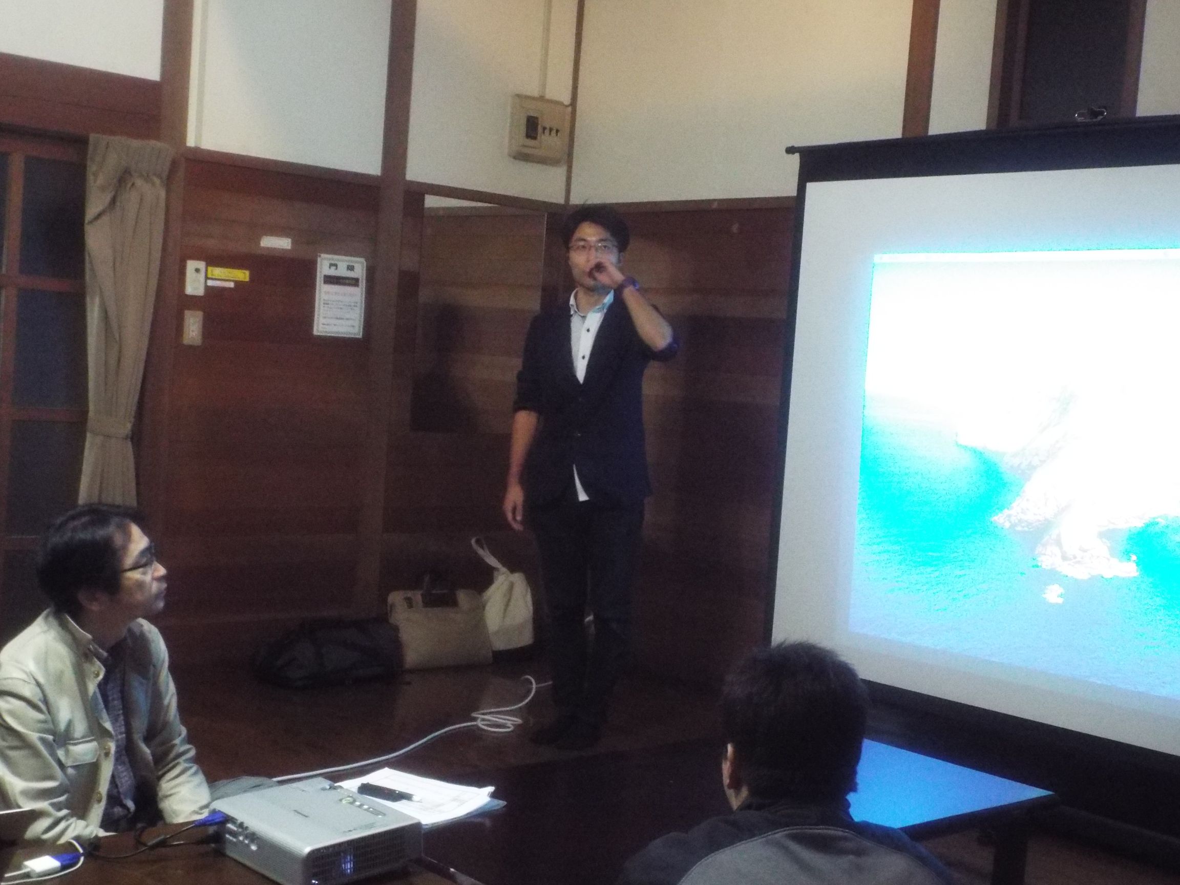 次に、秋保に移り、環境4年「卒業研修Ⅰ」の中間報告会を行いました。学生から活発な質疑応答が行われ、教員から質問や研究の取り組み方のアドバイスが行われました。