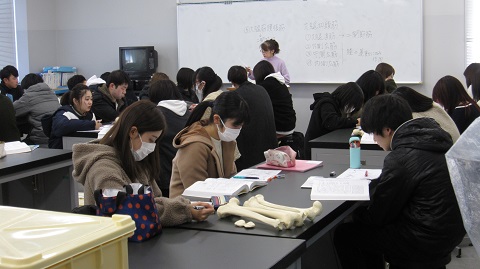骨の標本を机に並べ講義を聴き、骨のどの部分に筋が付着しているのかを確かめ、その筋が収縮したら骨をどの方向に動かすのかをイメージしながら勉強を進めています。