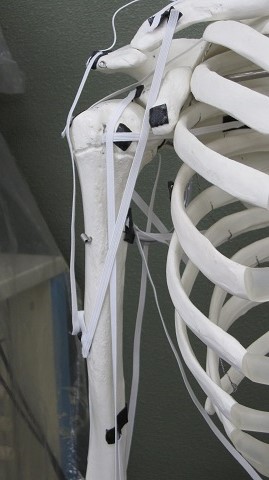 周りにある骨標本には、以前行った授業で筋の付着する場所を確かめながら、ゴムを筋に見立て貼りつけたものが残っています。実際に見ることが出来ない筋肉を、具体的にイメージしやすい教材を使って関節運動について理解を深めています。