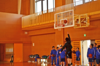 当日の体育はバスケットボールであり、パスやシュートといった基本技術の修得を目標にした授業でした。その授業に、バスケットボールの競技経験のある学生が参加し、生徒に対するデモンストレーションやシュート練習、基本技術のアドバイスといった支援を行いました。