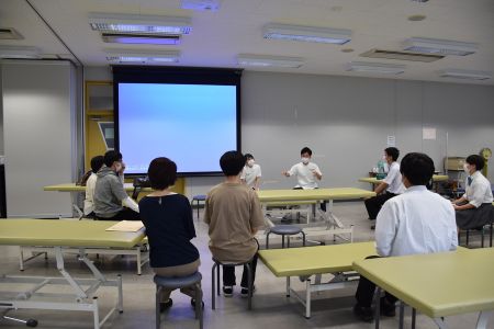 「実習室紹介」では,感染予防のためDVDを上映して理学療法学専攻で主に使用する実習室を紹介しました。