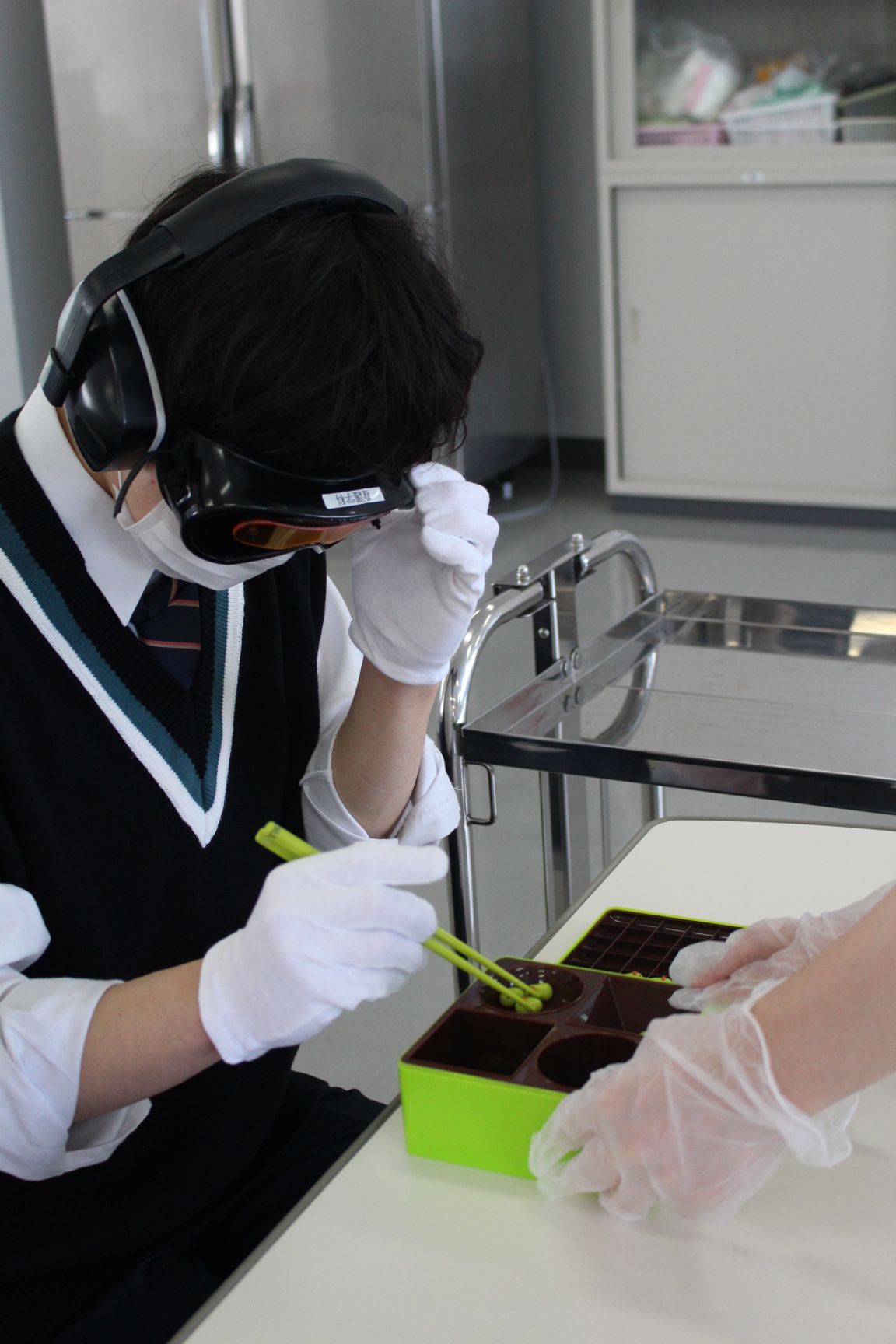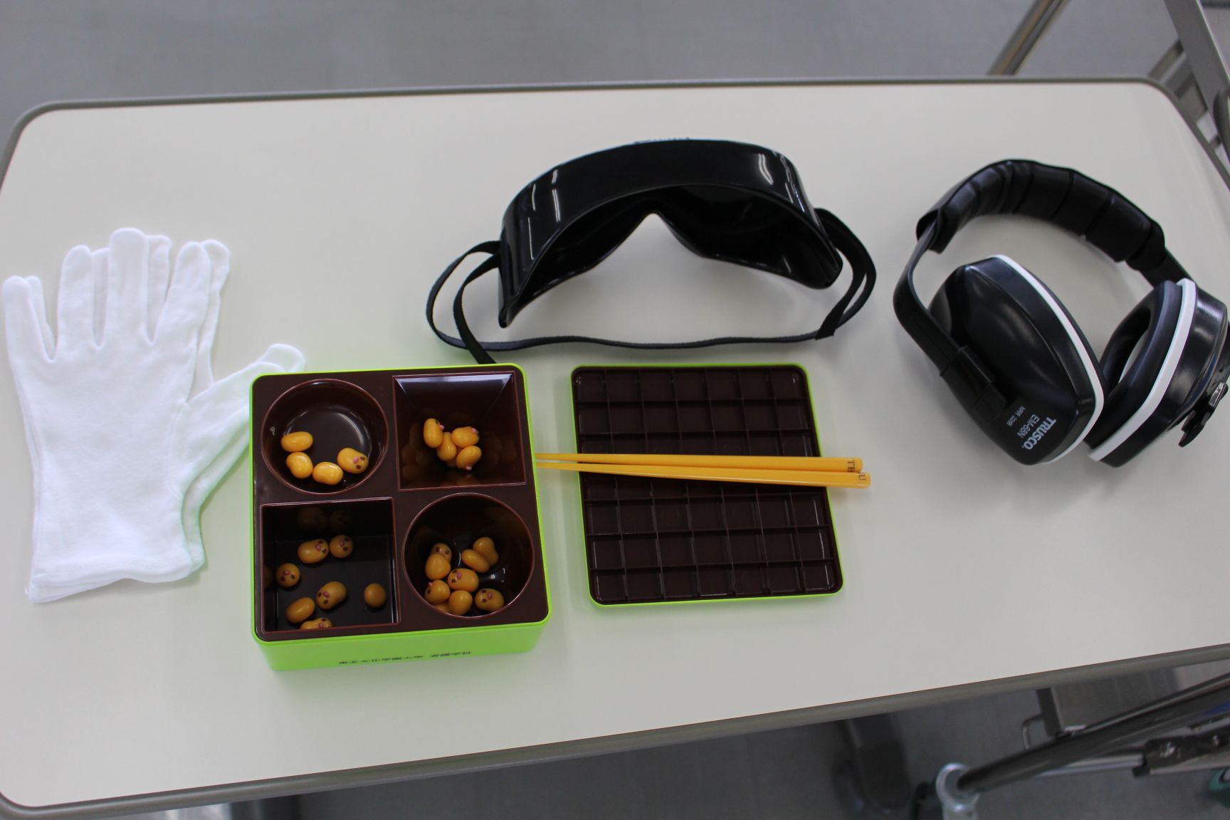 今回看護学科では、疑似体験装具をつけて高齢者の生活体験と、