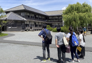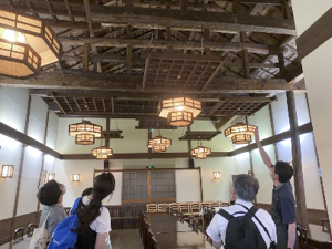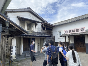 学生たちはそうした状況を踏まえて、訪れた教育資料館の職員及び自らも登米町のまちづくりを担っている藩政時代から続く味噌・醤油醸造の海老喜商店八代目の海老喜康和氏にヒアリングを行うなどして廻りました。