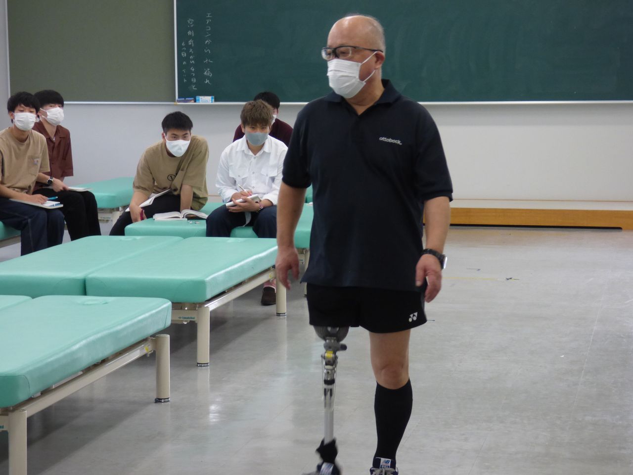 例年ですと、断端を間近で見せていただいたり、義足を触らせていただいたりするのですが、今年は距離を保っての実習となりました。